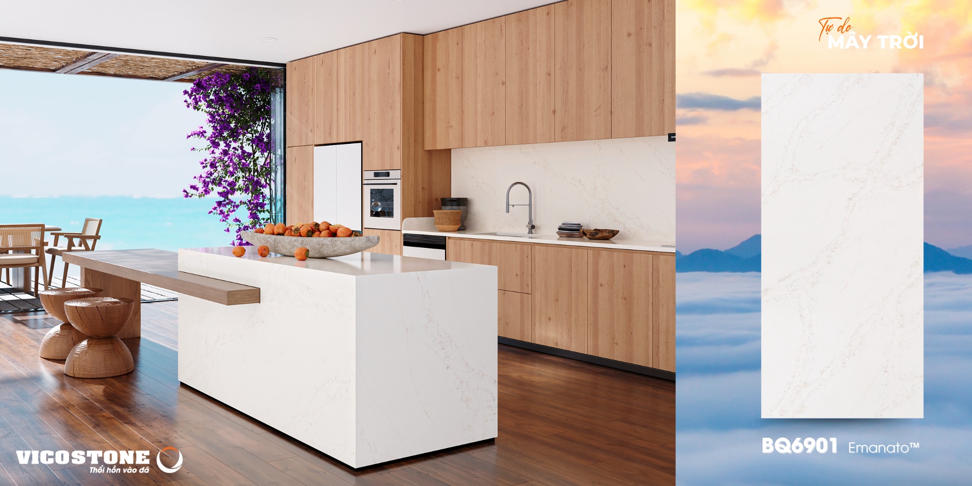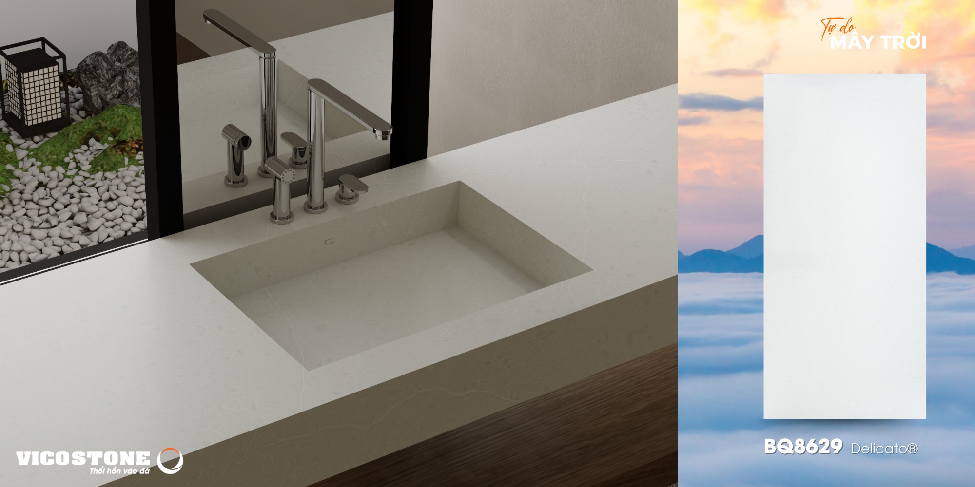 Nơi những áng mây trắng mềm mại ôm lấy không gian sống của bạn, Bộ sưu tập đá VICOSTONE® - Tự do mây trời (Above the Cloud) ra đời như một bản giao hưởng của sự tự do, hòa quyện giữa vẻ đẹp tinh khiết của thiên nhiên và tinh thần bền vững. Từng đường vân đá mảnh mai, thanh thoát tựa mây trời phiêu du, gợi lên khát khao vươn tới những chân trời rộng mở, nơi con người và đất mẹ hòa làm một.