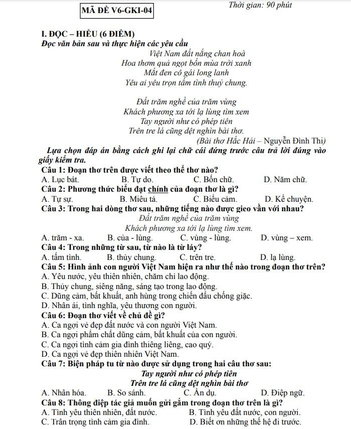 1. Đề thi văn giữa kì 1 lớp 6: Đề số 1