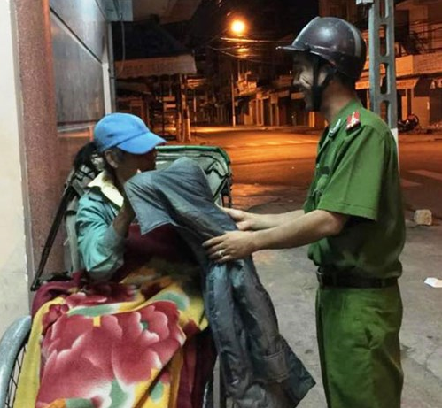 Ngọc Hải tặng chăn cho các mảnh đời cơ nhỡ. Ảnh: Thu Hien. Trước đây, việc từ thiện của thượng úy công an này chỉ mang tính chất cá nhân và không được lan tỏa. Dần dần, anh đứng ra kêu gọi mọi người và chia sẻ những hoạt động từ thiện trên Facebook.