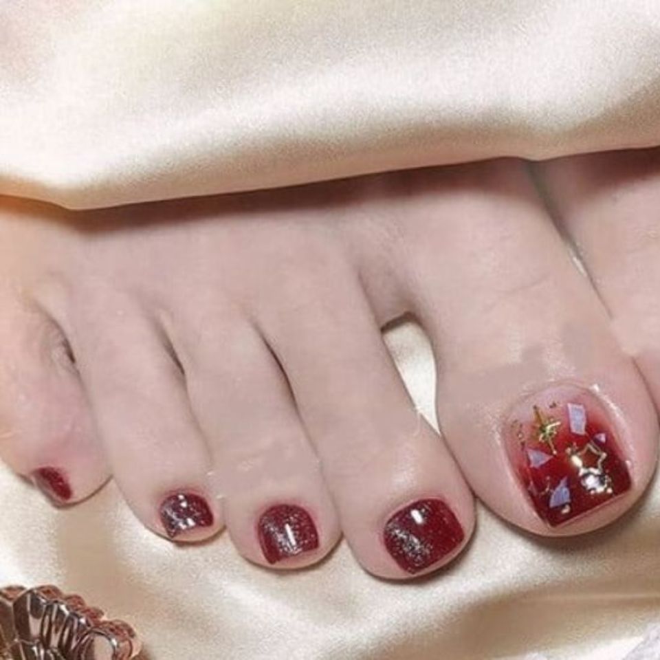 Nail chân đỏ rượu phối nhũ bạc hoặc vàng