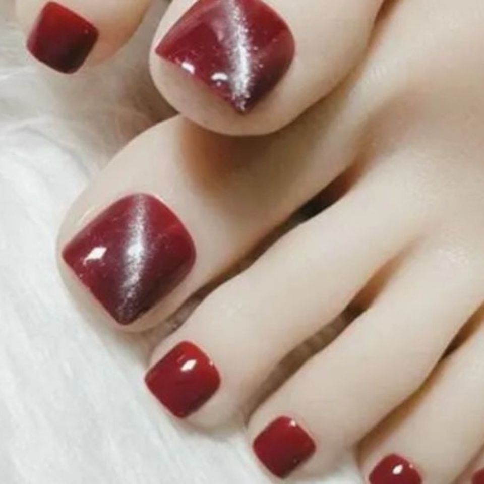 Kỹ thuật mắt mèo trên nền đỏ đô tạo hiệu ứng ánh sáng huyền ảo, nổi bật và thời thượng. Mẫu nail này mang lại vẻ đẹp hiện đại, quyến rũ, giúp bạn tạo điểm nhấn nổi bật cho đôi chân mà không cần phải làm quá cầu kỳ.