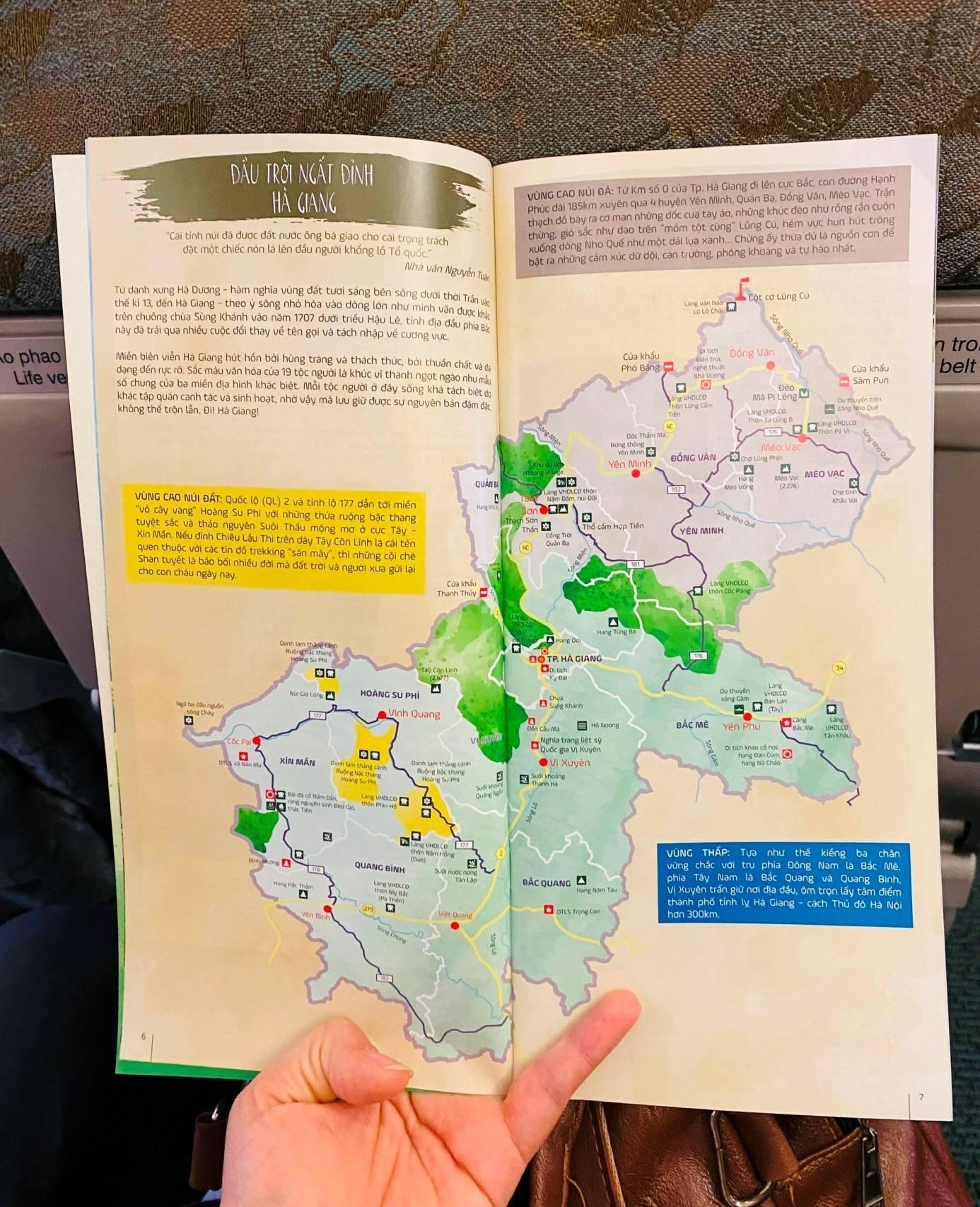 Có lẽ các bạn cũng như tôi, khi nhìn thấy những hình ảnh đẹp về quê hương, đất nước mình được đăng tải ở đâu đó đều cảm thấy rất đẹp và tự hào. Vì vậy, khi nhìn thấy những hình ảnh đẹp về quê hương Hà Giang được phát trên màn hình máy bay, tôi cũng như các bạn của mình đều trầm trồ, chăm chú quan tâm, theo dõi. Khi màn hình tắt chúng tôi lại nhìn thấy cuốn catalogue Heritage Guide ngay trước mặt với tiêu đề “Đi Hà Giang” đã giới thiệu, quảng bá nhiều địa danh, hình ảnh đẹp và các sản phẩm du lịch của Hà Giang, kèm theo đó là địa chỉ khách sạn, nhà hàng, khu nghỉ dưỡng, số điện thoại được phiên dịch ra nhiều thứ tiếng khác nhau.