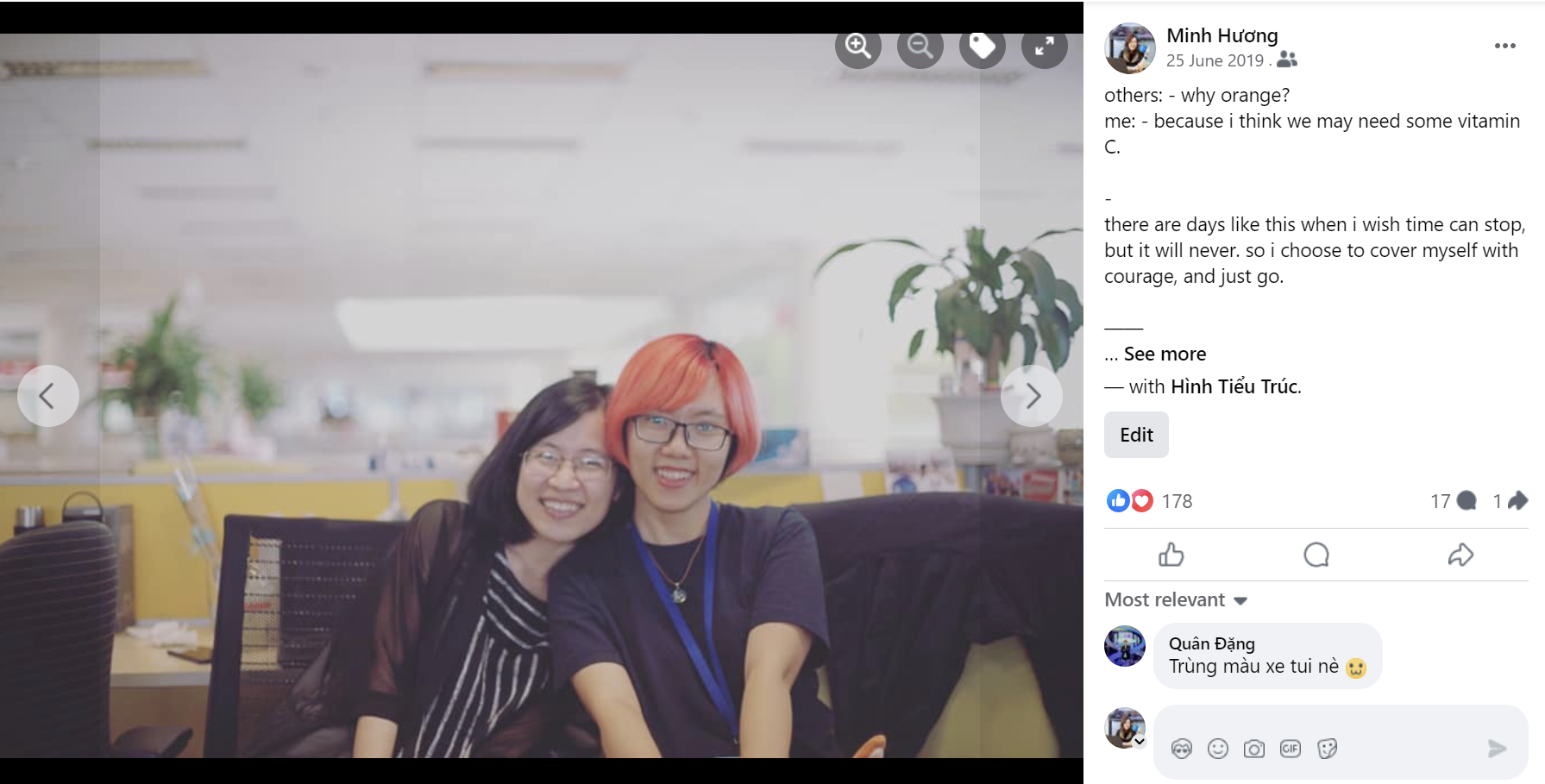 others: - why orange?me: - because i think we may need some vitamin C.there are days like this when i wish time can stop, but it will never. so i choose to cover myself with courage, and just go.______________tại sao lại là cam?tại chắc sẽ có lúc chúng mình cần Vitamin C.có những ngày mình ước thời gian dừng lại, nhưng làm gì mà được? nên thôi chọn tô lên mình chút can đảm và bước thôi.màu tóc dăm ba bữa thì lại đen, chứ mà tuổi trẻ thì làm gì còn lấy lại được?#tóc_cam_không_tham_lam#tóc_cam_không_càm_ràm