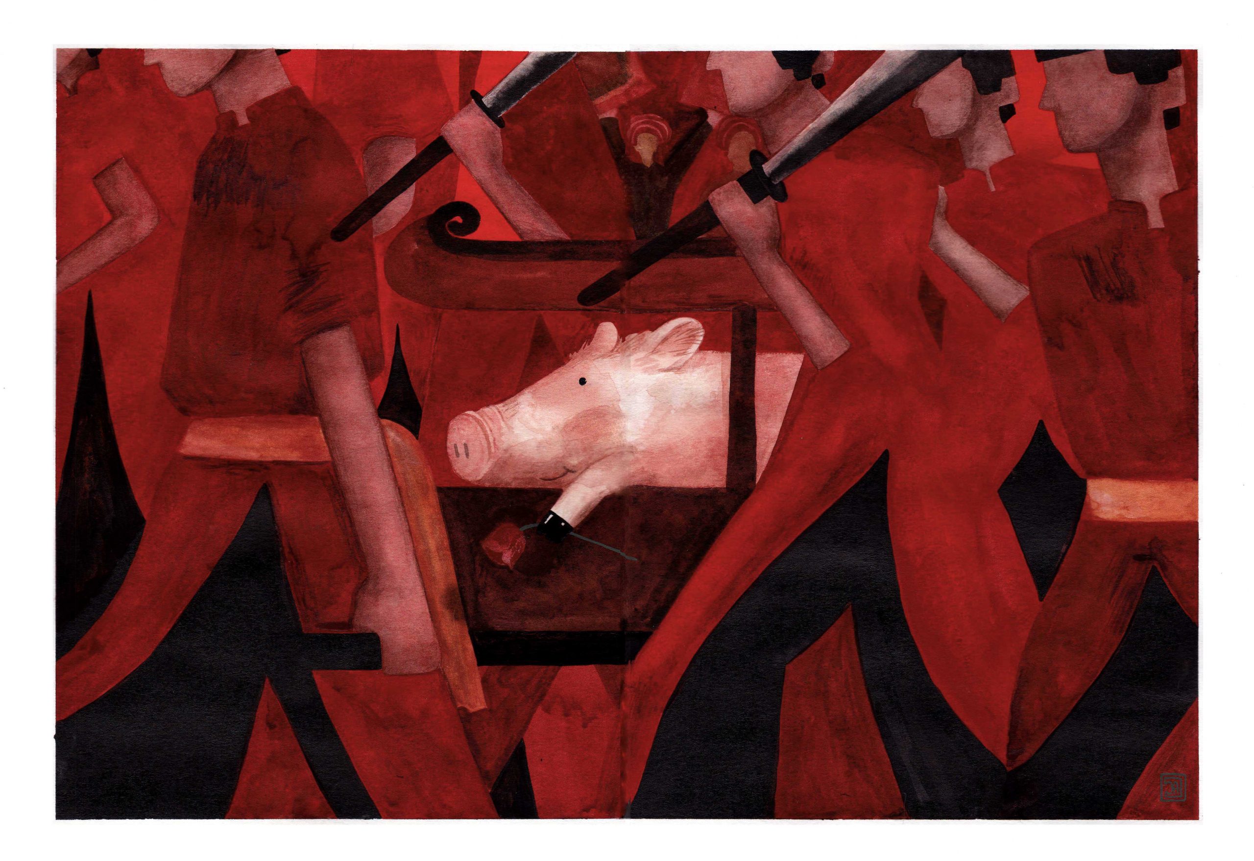 “Những người tham gia lễ hội rất vui và có chủ đích chỉ là chú lợn chưa biết số phận của mình đang như thế nào. Mình vẽ tranh này với sự đồng cảm với động vật, mình muốn hiểu chú lợn đang nghĩ gì trong khung cảnh lễ hội.” - Cô thổ lộ.